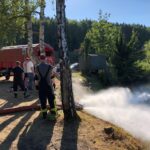 Auch wenn wir in dem Ferienmonat August eine Übungspause einlegen, haben wir uns aufgrund der aktuellen Wettersituation zusätzlich zu einer spontanen Übung getroffen. Eine Gruppe hat dazu mit dem Schlauchwagen geübt und die Wasserentnahme aus Gewässern vorgenommen. Eine Schweißtreibende Arbeit die beiden Saugleitungen zu Wasser zu bringen, F-Schlauch zur verlegen und entsprechend die Armaturen einzusetzen um Wasser über Strahlrohre abzugeben. Das entnommene Wasser wurde umgehend wieder dem Weiher zugeführt und damit auch dem Fischbestand etwas gutes getan.