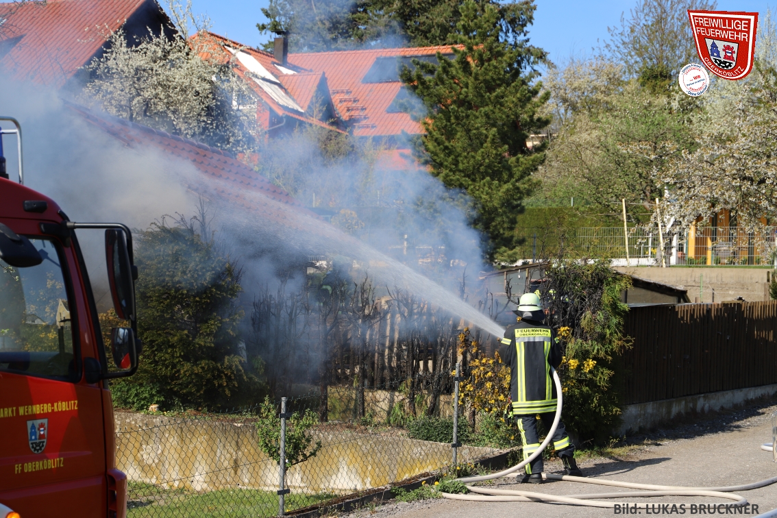 Brand Hecke lautete die Einsatzmeldung, zu der wir am späten Nachmittag nach Oberköblitz gerufen wurden. Bereits auf der Anfahrt rüsteten sich die ersten Atemschutztrupps aus, da die starke Rauchentwicklung weit sichtbar war. Vor Ort stellte sich heraus, dass das Feuer neben der Hecke bereits auf Kompost und eine an der Grundstückgrenze stehende Gartenhütte übergegriffen hatte. Aufgrund der aktuellen Trockenheit bestand auch weiterhin die Gefahr das sich das Feuer weiter ausbreiten würde.