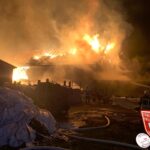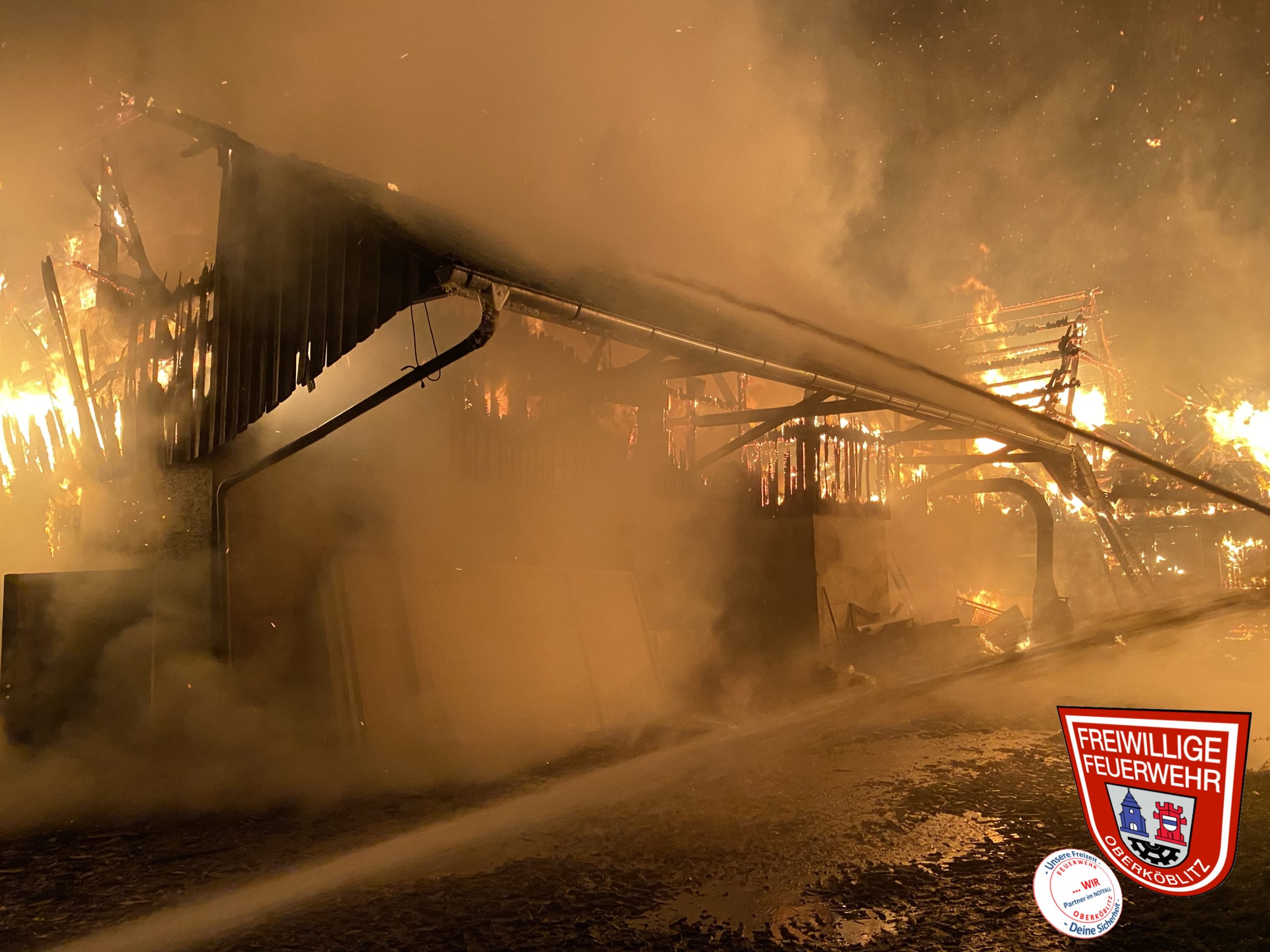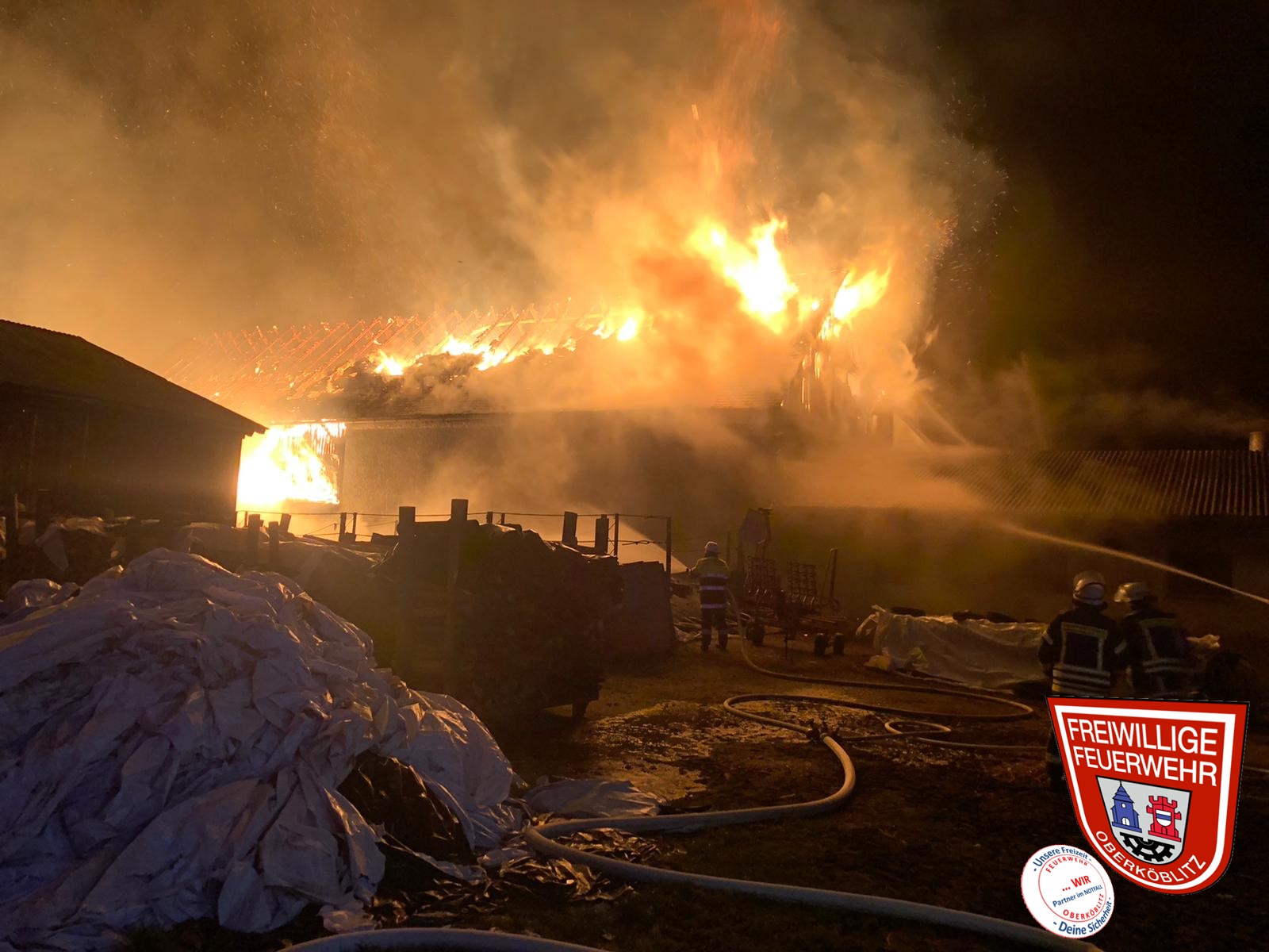 Hierzu setzten wir bis zu 5 Strahlrohre im zugewiesenen Bereich ein. Ebenso war ein Trupp unter Atemschutz im Innenbereich der Stallung eingesetzt, um auch hier eine Ausbreitung zwischen den zusammengebauten Gebäudeteilen eines Anwesens zu verhindern.