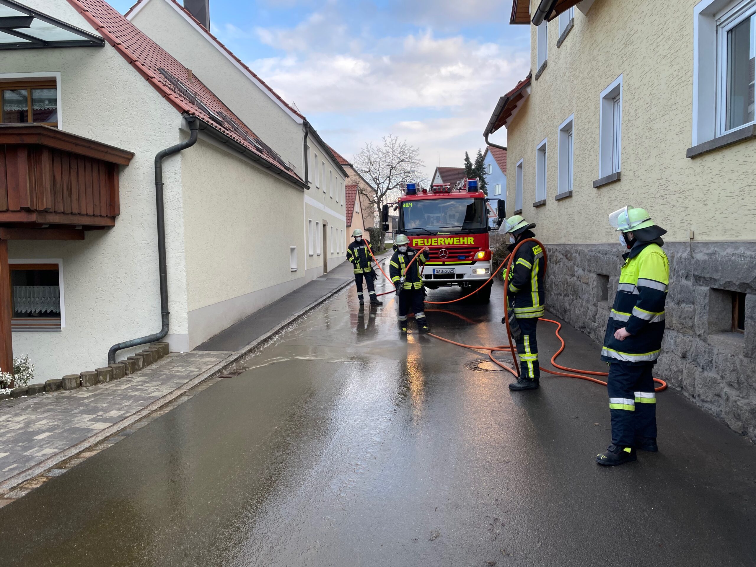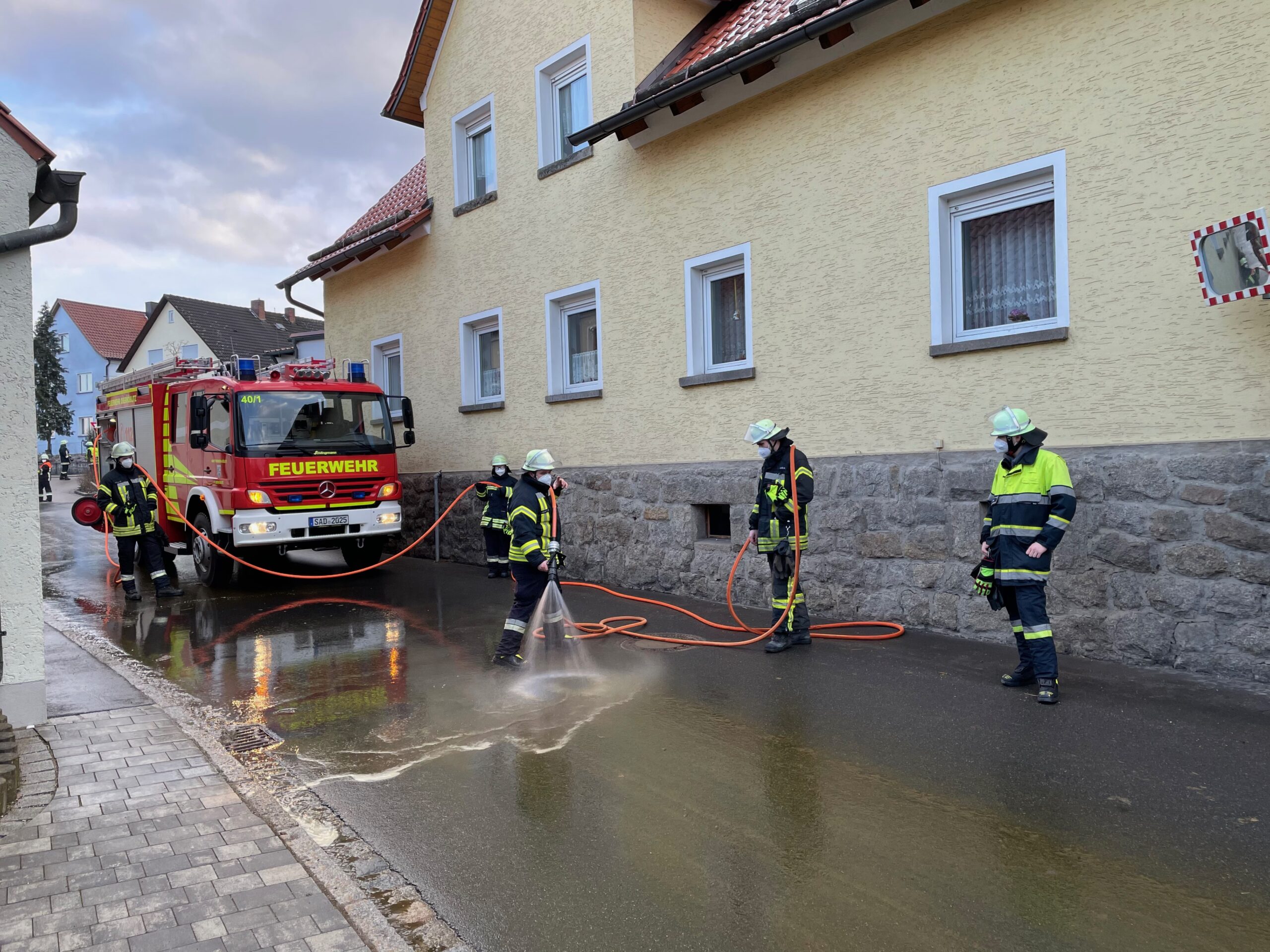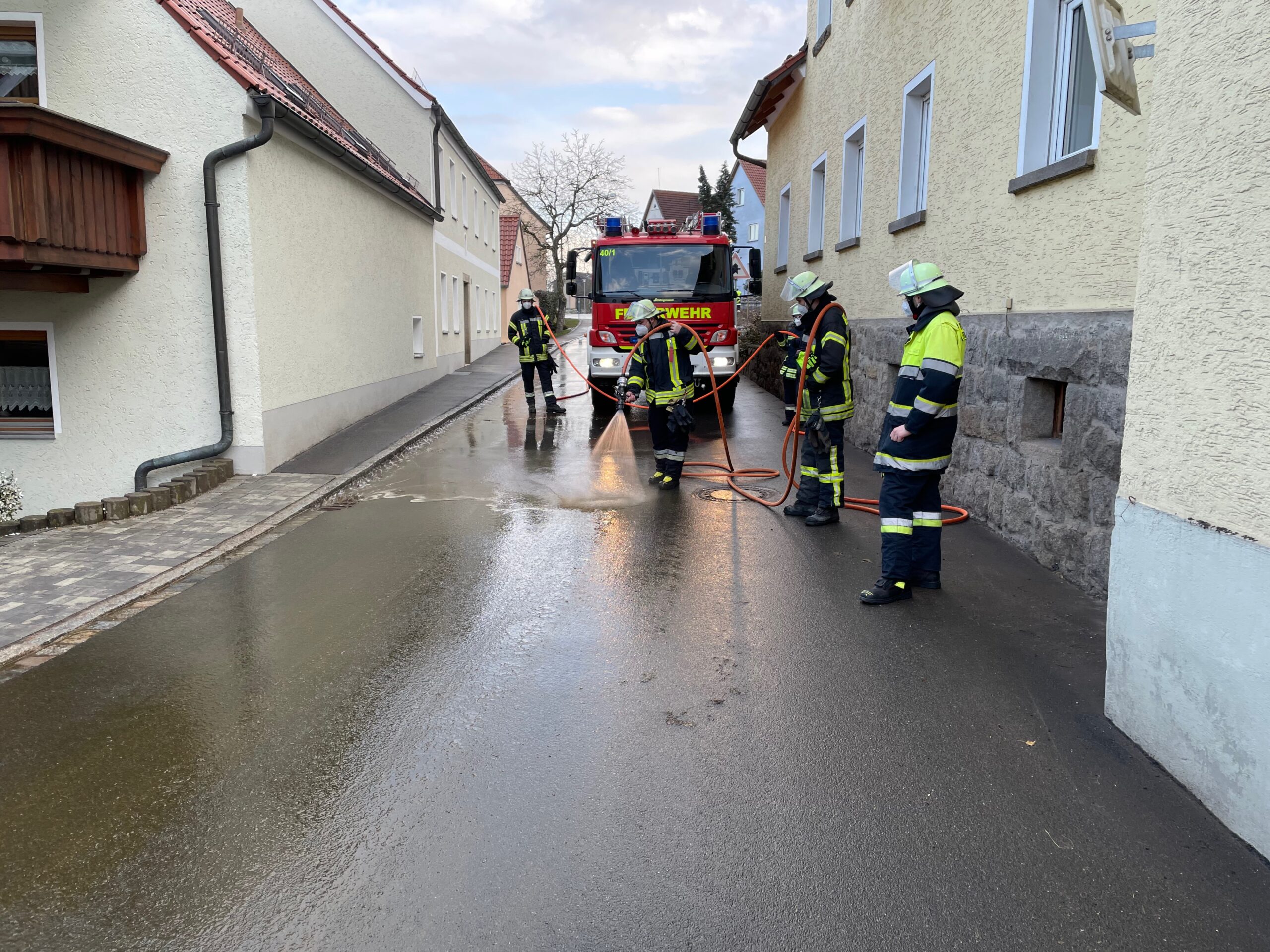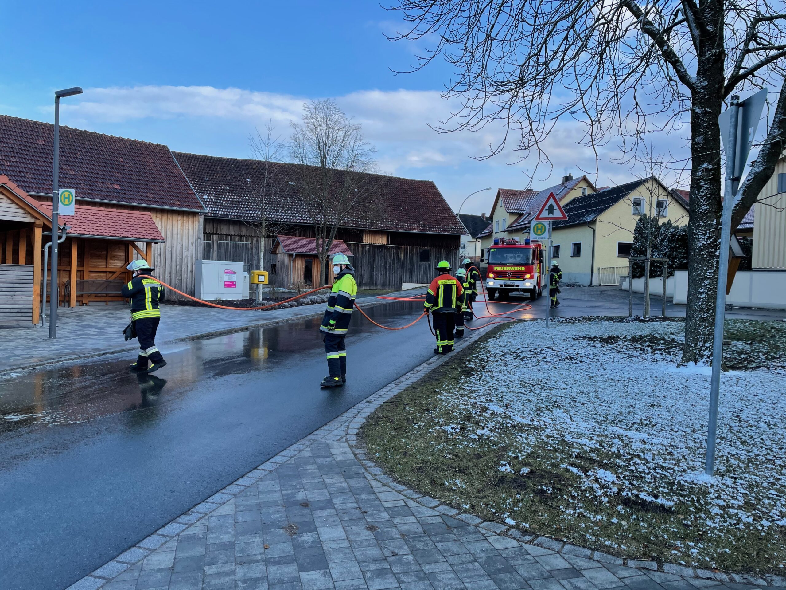 Wir wurden auf Anforderung durch die FF Saltendorf mit unseren wasserführenden Fahrzeugen zur Beseitigung einer Güllespur in die Ortsmitte von Saltendorf nachalarmiert. Hier hatte ein landwirtschaftliches Fahrzeug Gülle verloren.