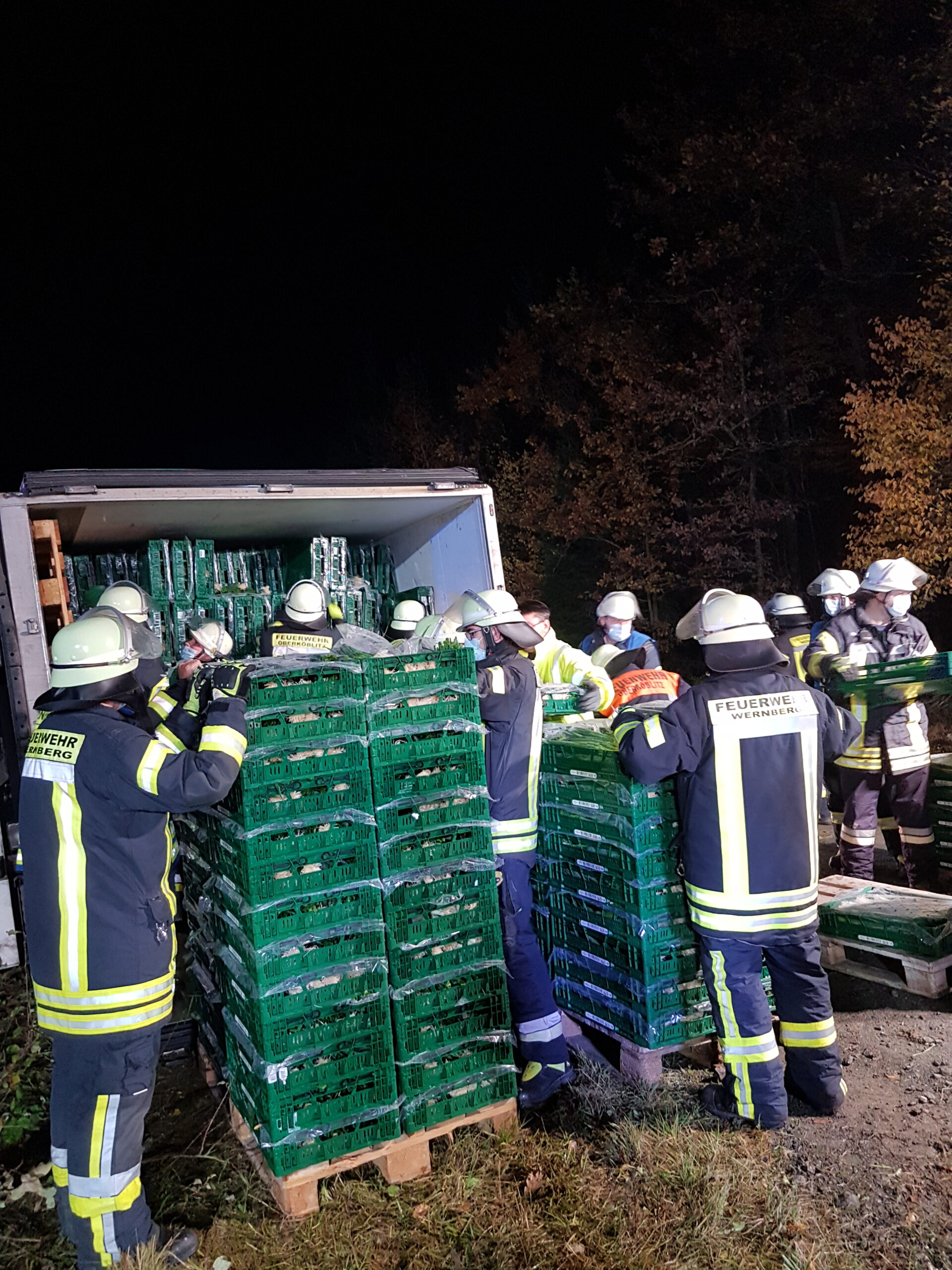 Da sich die Bergung mit voller Ladung schwierig darstellte, räumten wir zusammen mit der Feuerwehr Wernberg und den Abschleppunternehmen mit vereinten Kräften den mit Gemüse voll beladenen LKW aus. Gegen 20 Uhr, als der LKW leer geräumt war wurde die Autobahn zur LKW Bergung durch unseren VSA und der nachalarmierten FF Losau-Schiltern komplett gesperrt. Da durch den Unfall selbst und die Bergung die Fahrbahn verunreinigt war, musste diese noch gereinigt werden. Gegen 21:30 Uhr wurde die Autobahn wieder freigegeben und wir konnten die Einsatzstelle wieder verlassen.
