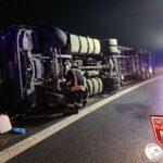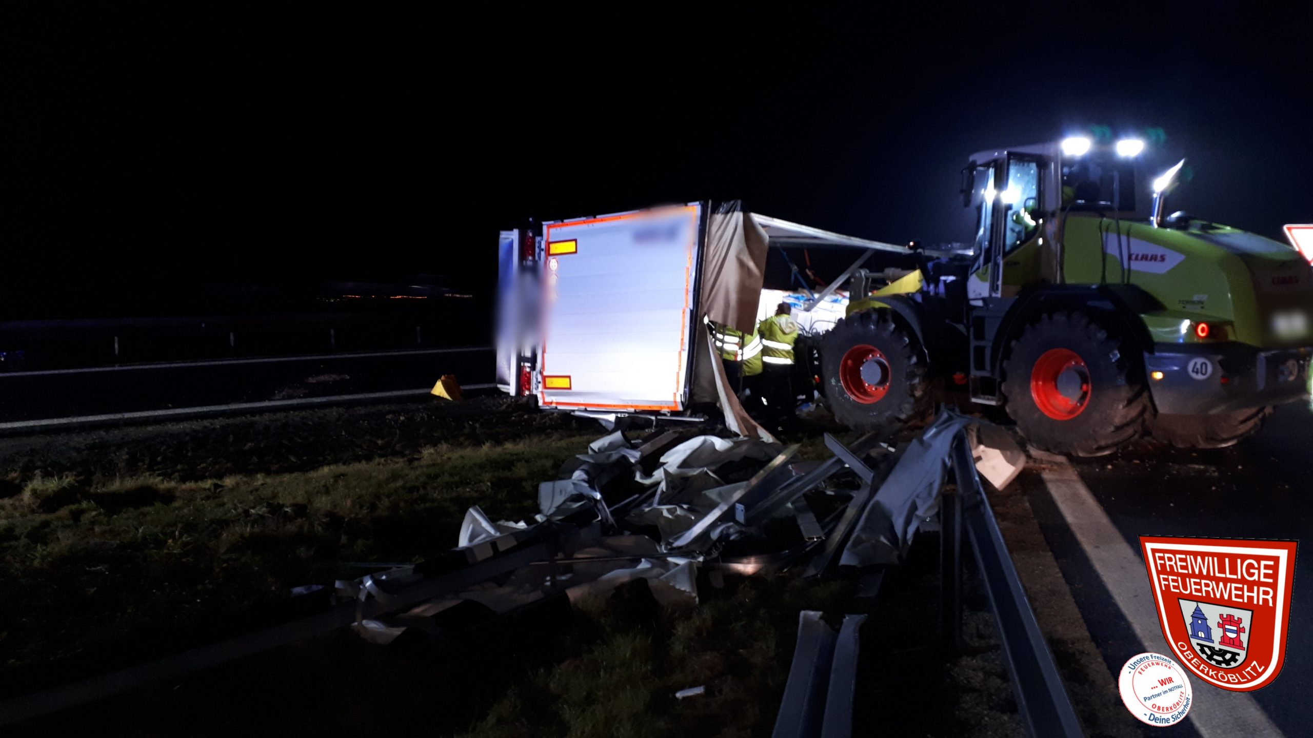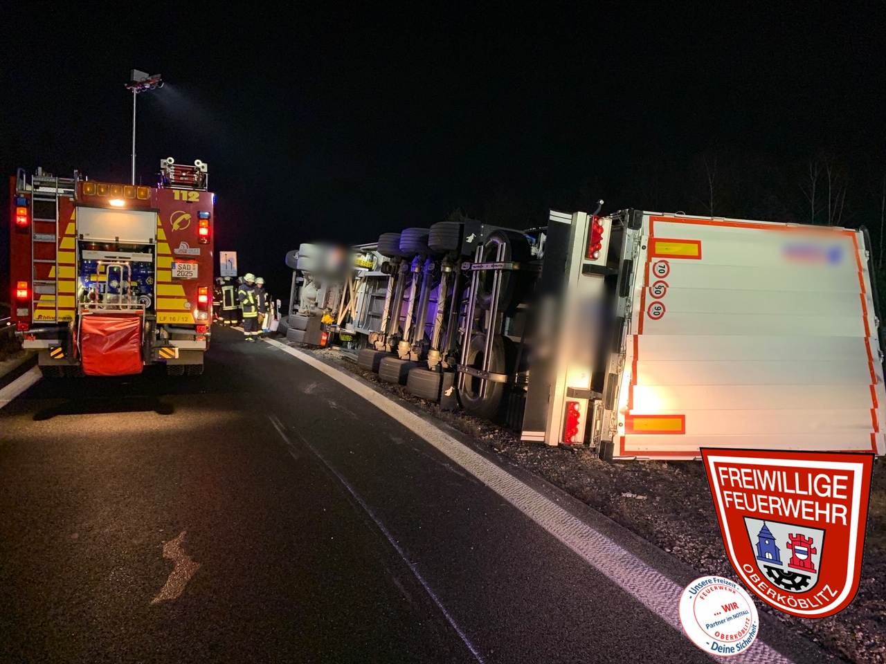 Am Montag Abend wurden wir von der Leitstelle Amberg zu einem LKW Unfall an das Autobahnkreuz Opf. Wald alarmiert. Bereits bei der Anfahrt lautete die Meldung das der LKW umgestürzt sei und auf der Seite liege, der Fahrer aber bereits aus dem Führerhaus befreit sei. Beim Eintreffen an der Einsatzstelle übernahmen wir gleich die Verkehrslenkung und kümmerten uns um die auslaufenden Betriebsstoffe. Nach Absprache mit der Autobahnmeisterei, Polizei und des Bergungsunternehmens blieben wir mit 2 Fahrzeugen zum Ausleuchten an der Einsatzstelle während der Bergung vor Ort. Die Verkehrslenkungsmaßnahmen übernahm für uns die Autobahnmeisterei aus Schwandorf somit konnten wir unsrere Kräfte auf ein Minimum reduzieren. Nach mehreren Stunden konnten wir die Einsatzstelle wieder verlassen.