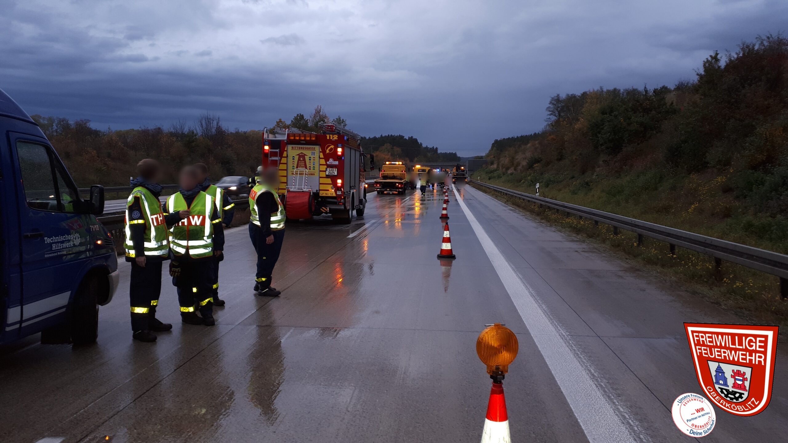 Aufgrund auslaufender Betriebsstoffe und zur Sicherheit für die Beteligten sowie der Einsatzkräfte wurde dann der Verkehrs einspurig über die Standspur vorbei geleitet. Hier wurden wir von der Autobahnbereitschaft des THW Nabburg unterstützt.