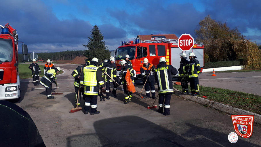 Zusammen mit der örtlich zuständigen Feuerwehr Neunaigen wurden auslaufende Betriebsstoffe gebunden. Nachdem das Fahrzeug durch einen Abschleppdienst abgeschleppt war, reinigten wir noch gemeinsam die Fahrbahn.