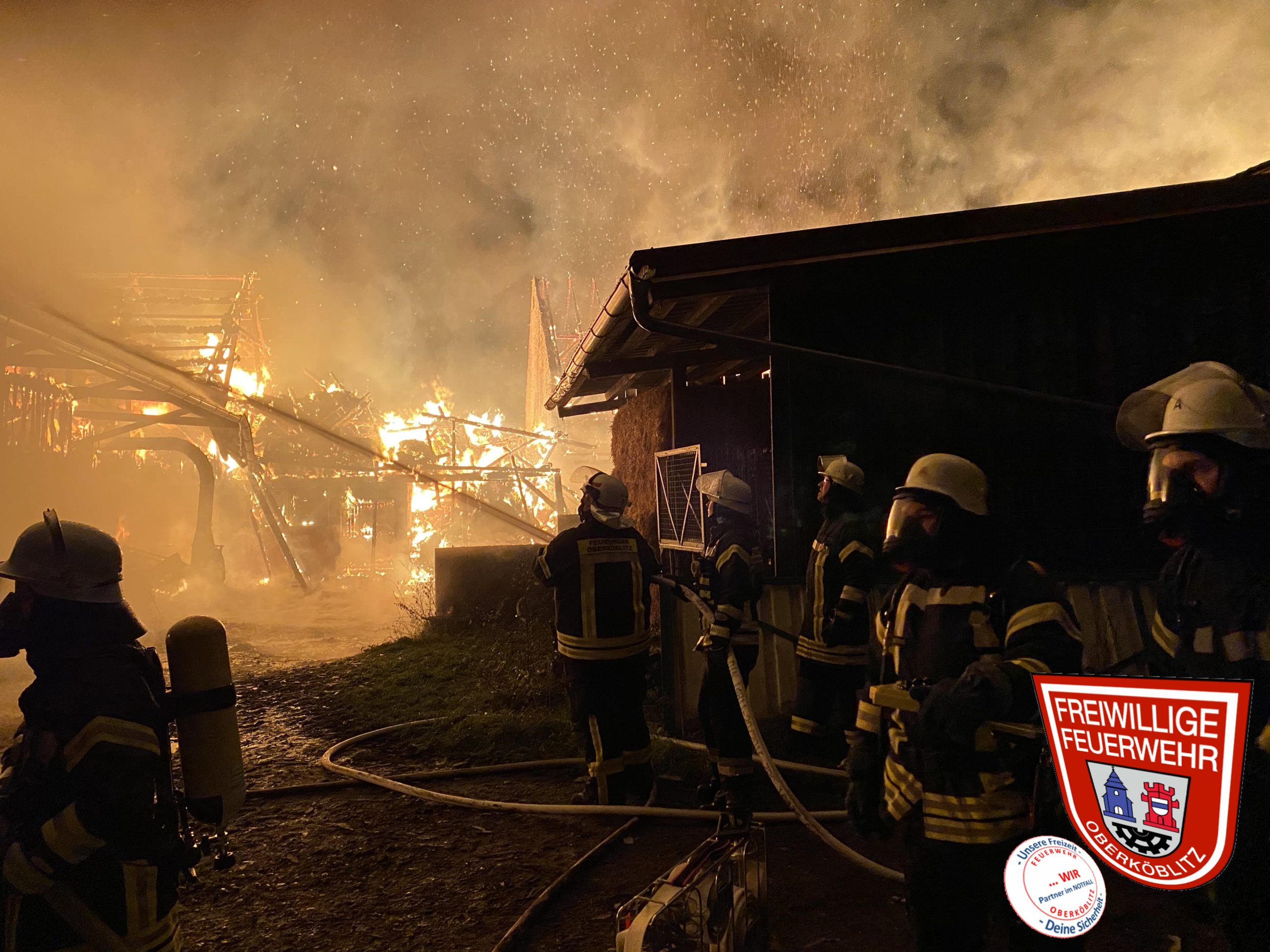 Hierzu setzten wir bis zu 5 Strahlrohre im zugewiesenen Bereich ein. Ebenso war ein Trupp unter Atemschutz im Innenbereich der Stallung eingesetzt, um auch hier eine Ausbreitung zwischen den zusammengebauten Gebäudeteilen eines Anwesens zu verhindern.