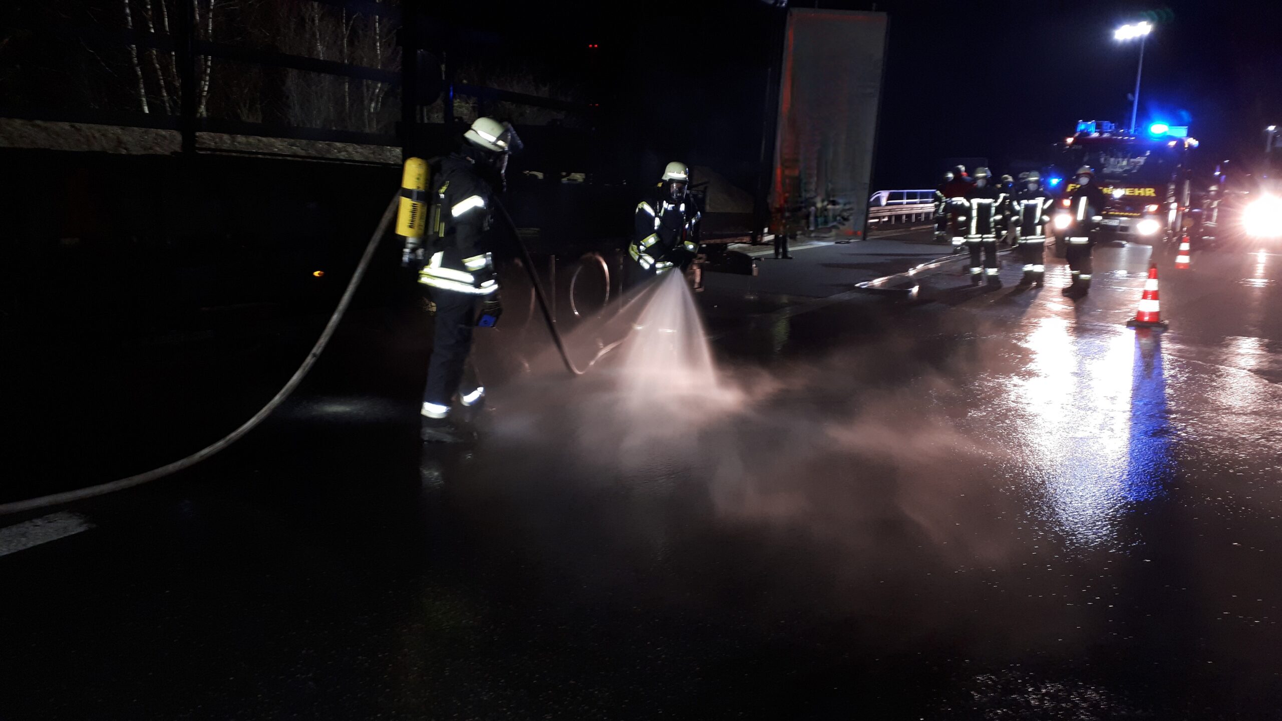 Beim Eintreffen an der Einsatzstelle konnte bereits unter dem Auflieger Feuer festgestellt werden. Je ein Atemschutztrupp von der FF Wernberg und von uns, konnte das Feuer schnell unter Kontrolle bringen. Hierzu wurde die BAB kurzzeitig für den Verkehr gesperrt. Wir unterstützen die FF Wernberg bei den Löscharbeiten, Ausleuchtung der Einsatzstelle und der Verkehrsabsicherung durch unserem VSA. Nach ca. 2 Stunden konnten die ersten Löschfahrzeuge die Einsatzstelle wieder verlassen, unser VSA und MZF blieben bis zum Ende für die Verkehrsabsicherung an der Einsatzstelle.